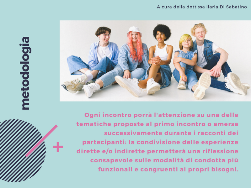 L'attenzione sarà posta sulla problematica scelta o emersa nei racconti dei partecipanti: la condivisione delle esperienze dirette e/o indirette permetterà una riflessione consapevole sulle modalità più funzionali e corrette per raggiungere gli obiettivi futuri.