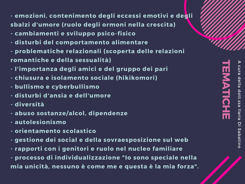 Una serie di incontri in cui verranno trattate diverse tematiche essenziali nella crescita e nello sviluppo psico-fisico dell'adolescente: